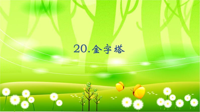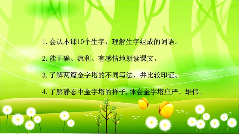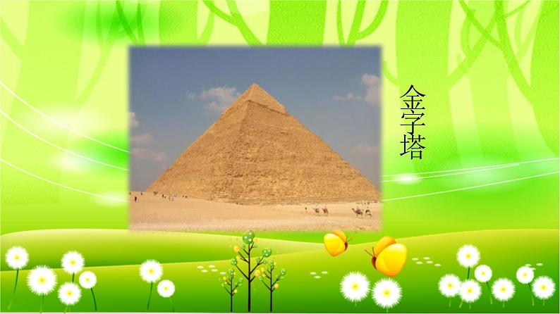 1.会认本课10个生字,理解生字组成的词语。 2.能正确、流利、有感情地朗读课文。3.了解两篇金字塔的不同写法,并比较印证。4.了解静态中金字塔的样子,体会金字塔庄严、雄伟。