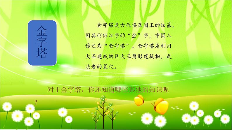 你还知道哪些关于金字塔的知识呢?课下查一下资料,同学间交流。