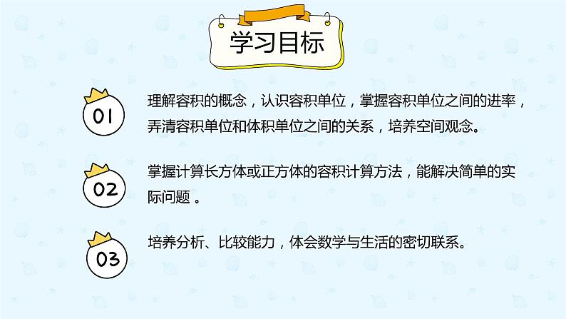 理解容积的概念,认识容积单位,掌握容积单位之间的进率,弄清容积单位和体积单位之间的关系,培养空间观念。