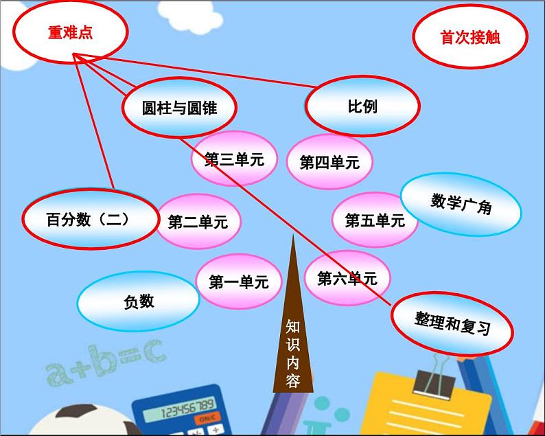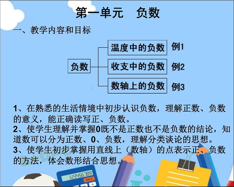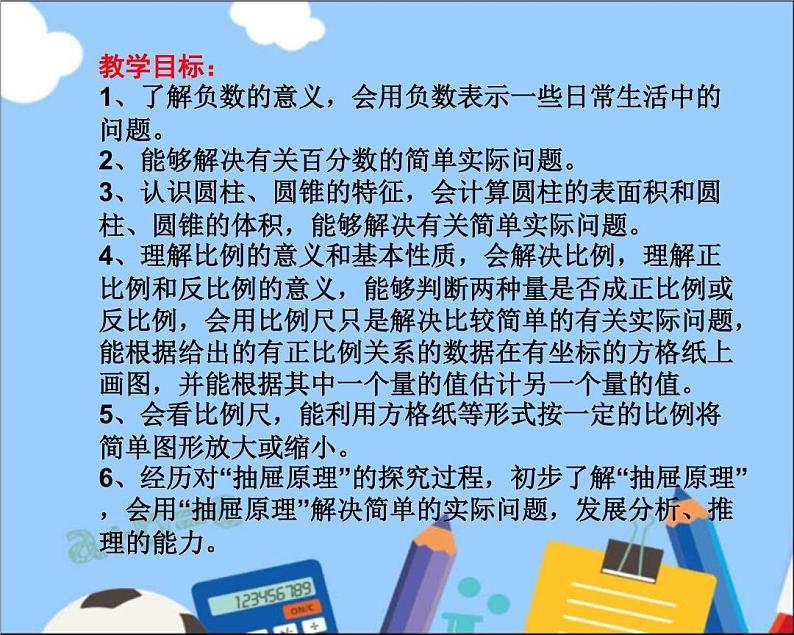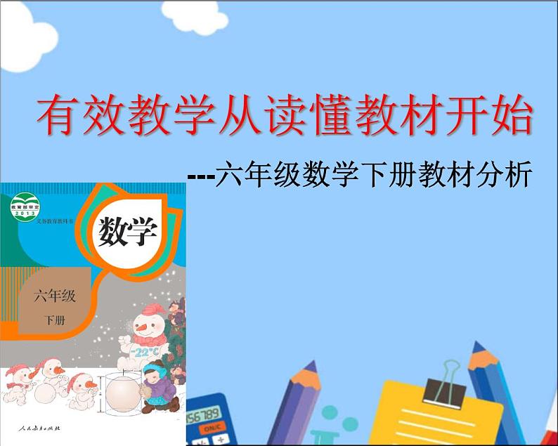 有效教学从读懂教材开始---六年级数学下册教材分析知识内容第二单元第一单元第三单元第四单元第五单元第六单元比例数学广角重难点整理和复习整理和复习圆柱与圆锥圆柱与圆锥百分数(二)百分数(二)首次接触比例负数教学目标:1、了解负数的意义,会用负数表示一些日常生活中的问题。2、能够解决有关百分数的简单实际问题。 3、认识圆柱、圆锥的特征,会计算圆柱的表面积和圆柱、圆锥的体积,能够解决有关简单实际问题。4、理解比例的意义和基本性质,会解决比例,理解正比例和反比例的意义,能够判断两种量是否成正比例或反比例,会用比例尺只是解决比较简单的有关实际问题,能根据给出的有正比例关系的数据在有坐标的方格纸上画图,并能根据其中一个量的值估计另一个量的值。5、会看比例尺,能利用方格纸等形式按一定的比例将简单图形放大或缩小。6、经历对“抽屉原理”的探究过程,初步了解“抽屉原理”,会用“抽屉原理”解决简单的实际问题,发展分析、推理的能力。7、经历从实际生活中发现、提出、分析和解决问题的过程,体会数学在日常生活中的作用,初步形成综合运用数学知识解决问题的能力。8、通过系统的整理和复习,加深对小学阶段所学的数学知识的理解和掌握,形成比较合理的、灵活的计算能力,发展思维能力、空间观念和数据分析观念,提高综合运用所学数学知识解决问题的能力。9、体会解决问题策略的多样性及运用数学思想方法解决问题的有效性、优越性,感受数学魅力。形成发现生活中的数学意识,初步形成观察、分析及运用数学思想方法解决问题的能力。10、体会学习数学的乐趣,提高学习数学的兴趣,建立学好数学的信心。11、养成认真作业、书写整洁的良好习惯。1、改进负数的编排,加深学生对数概念的理解,认识数系扩充的必要性。2、改进比例的编排,突出函数思想。3、加强综合与实践的编排,培养发现、提出、分析和解决数学问题的能力。4、改进整理和复习的编排,使学生所学的数学知识系统化、结构化,做好中小学数学教学的衔接。5、加强数学思想方法的教学,培养学生数学思维能力和提高数学素养。6、情感、态度、价值观的培养渗透于数学教学中,用数学的魅力和学习的收获激发学生的学习兴趣与内在动机。教材编写特点第一单元 负数1、在熟悉的生活情境中初步认识负数,理解正数、负数的意义,能正确读写正、负数。2、使学生理解并掌握0既不是正数也不是负数的结论,知道数可以分为正数、0、负数,理解分类谈论的思想。3、使学生初步掌握用直线上(数轴)的点表示正、负数的方法,体会数形结合思想。一、教学内容和目标二、教学中需注意的问题温度、收支、相对水位、海拔、负增长……1.在具体生活情境中认识负数。2.结合现实素材对正、负号所表示的不同含 义加以区分。温度是+2℃,温度是-2℃。温度上升2℃用+2℃表示,下降2℃用-2℃表示。数轴上原点左边某点用-1表示,右边某点用1表示。向东走1m用+1m表示,向右走1m用-1m表示。顺时针、逆时针的角度表示。第二单元 百分数(二)两段“百分数”的侧重点不同六年级上册:百分数意义的理解、把分数相应数量关系迁移类推到百分数来解决一般性的百分数实际问题。六年级下册:理解四类特殊百分数(折扣、成数、税率、利率)的现实含义,除了掌握一般性的数量关系以外,更需要学生理解很多“数学之外”的知识,如税务知识、金融知识等。二、教学中需注意的问题1.加强数学与实际生活的联系,培养学生应用数学的意识。习题中编入这样的素材,可以帮助学生更好地理解百分数在商业生活中的广泛、灵活的应用。2.开放教学过程,培养学生综合应用数学的能力。调查、收集相关信息,设计合理的存款方案,学会科学理财,将提高学生的实践能力落到实处。第三单元 圆柱与圆锥二、教学中需注意的问题加强数学知识与实际生活的联系,提高运用所学知识解决实际问题的意识与能力。引导学生经历知识的探索过程,培养自主解决问题的能力。充分关注操作与想象相结合,发展学生的空间观念。第四单元 比例二、教学中需注意的问题应让学生理解变量、常量等概念,初步渗透函数思想。从数到量,从计算到关系,从算术到代数。C=πd,所以当直径不变时,圆的周长与圆周率成正比例关系。函数的核心就是“把握并刻画变化中的不变,其中变化的是‘过程’,不变的是‘规律’(关系)”。提高学生综合运用知识的能力。 比、比例、解方程、测量(长度、面积)、方位……第五单元 数学广角——鸽巢问题一、具体编排应让学生初步经历“数学证明”的过程。要有意识地培养学生的“模型思想”。重视实践活动,在自主探究中理解原理,由具体的情形推广到一般。要恰当把握教学要求。二、教学中需注意的问题第六单元 整理和复习二、整理与复习的总体目标整理——完善知识体系复习——巩固知识技能沟通——达到融会贯通提升——做好中小衔接三、教学中需注意的问题加强整理和复习的系统性。(完善知识)关注概念的理解。(重点、关键)启发、引导学生在理解的基础上自主整理知识。(创设问题情景、引发学生梳理)在系统整理、复习的过程中注意查漏补缺。加强练习的针对性、有效性。(精讲多练) 注意引导学生积累数学学习的经验,总结