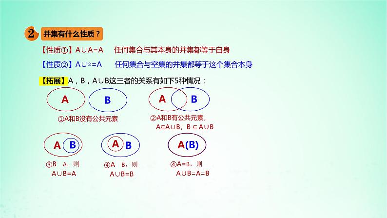 【性质②】A∪∅=A 任何集合与空集的并集都等于这个集合本身