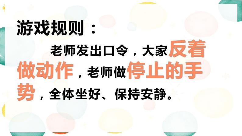 游戏规则: 老师发出口令,大家反着做动作,老师做停止的手势,全体坐好、保持安静。
