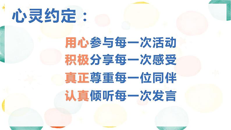 用心参与每一次活动积极分享每一次感受真正尊重每一位同伴认真倾听每一次发言