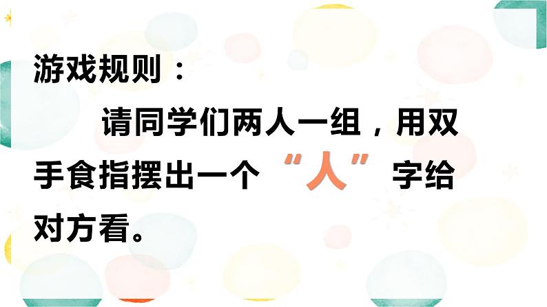 游戏规则: 请同学们两人一组,用双手食指摆出一个“人”字给对方看。