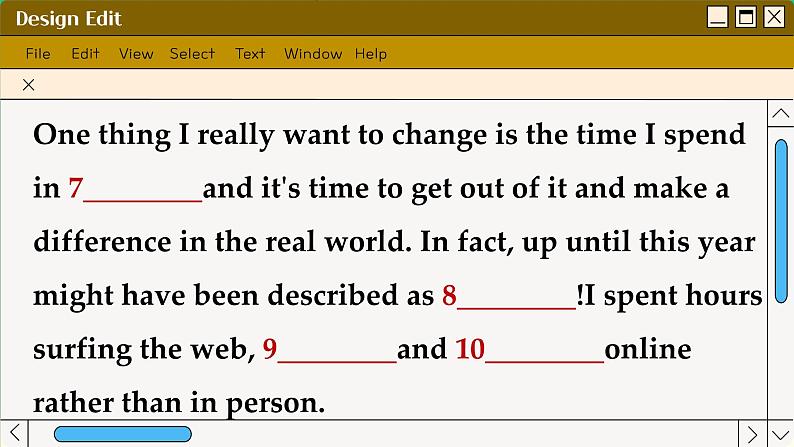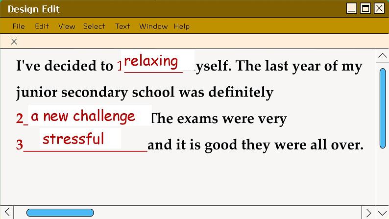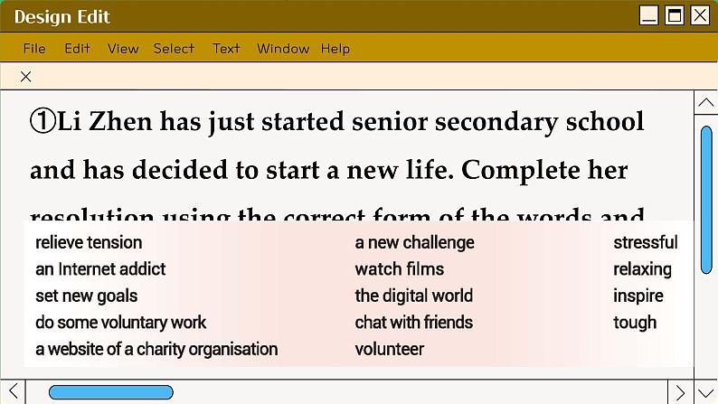 UNIT 1 LIFE CHOICESCHECK YOUR PROGRESSUse what you have learnt from the unit “Life Choices" to talk about a new school life, stress reduction, and future life choices.利用你从“生活选择”单元中学到的知识,谈谈新的学校生活、减压和未来的生活选择。①Li Zhen has just started senior secondary school and has decided to start a new life. Complete her resolution using the correct form of the words and phrases below.Now I have become a senior secondary student and this means have an opportunity to become a different person, a much better one!现在我已经成为一名高中生,这意味着我有机会成为一个不同的人,一个更好的人!I've decided to 1________myself. The last year of my junior secondary school was definitely 2_________________The exams were very 3_________________and it is good they were all over.Now, how to spend the next three years more wisely is 4___________for me. I think I will need to play more sports. I will join a basketball club because it will help me to 5________ I also plan to do more long-distance running because I find it very 6________One thing I really want to change is the time I spend in 7________and it's time to get out of it and make a difference in the real world. In fact, up until this year might have been described as 8________!I spent hours surfing the web, 9________and 10________online rather than in person. A few weeks ago when I was surfing the Internet I came across 11________. It supports children who struggle to read and write and they have 12__________who spend time with children who need help. From the moment I read about it I knew I wanted to help.by their energy and excitement and I know that I would love in the future. I'll write to them soon and hopefully I can join them. I'm really 13________to 14________Actually, in the future, maybe I can start my own charity.②Complete the posts about stress using the correct form of the words and phrases in brackets. Then choose one person and give your suggestions for him / her to reduce stress.用括号中单词和短语的正确形式完成关于重音的帖子。然后选择一个人,并为他/她提供减轻压力的建议。③Complete the dialogue between two new school friends about hobbies. Use the words and phrases below. Some of them can be used more than once.Love like don't mind don't likeLi Zhen: What's your hobby, Chen Yang? Do you 1__________music?Chen Yang: I'm a music lover I just 2 ____________ listening to music, especially the songs of my favourite pop group. I can listen to them all day long. What sort of music do you like? lovelikeLi Zhen: I‘m not really a music fan. In particular I 3___________rock music because it’s so noisy. I can‘t stand it!我不是一个真正的乐迷。我不是特别喜欢摇滚乐,因为它太吵了。我受不了!don't likeChen Yang: Really? Well, I guess I 4___________some rock music once in a while. But like you, I 5___________it much when people play loud music when I'm trying to relax.don't mindlikeUNIT DIARYWhat have you learnt in this unit? Reflect and complete the diary.