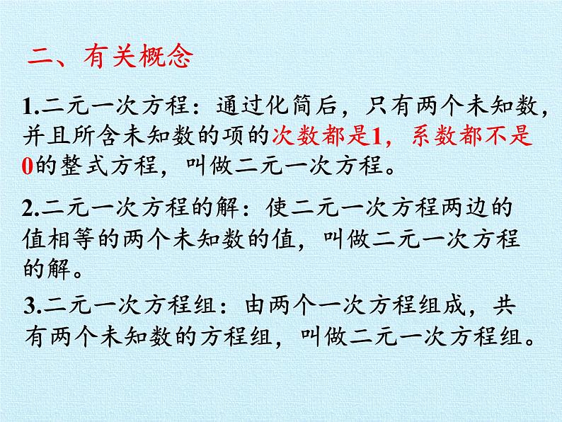 1.二元一次方程:通过化简后,只有两个未知数,并且所含未知数的项的次数都是1,系数都不是0的整式方程,叫做二元一次方程。