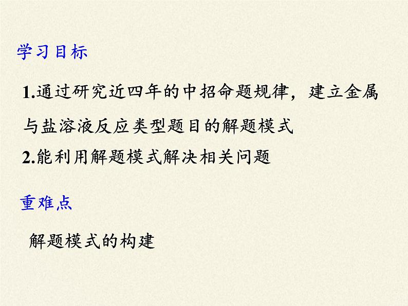 1.通过研究近四年的中招命题规律,建立金属与盐溶液反应类型题目的解题模式2.能利用解题模式解决相关问题