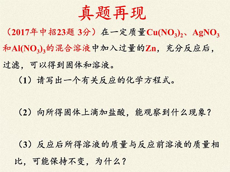 (2017年中招23题 3分)在一定质量Cu(NO3)2、AgNO3和Al(NO3)3的混合溶液中加入过量的Zn,充分反应后,过滤,可以得到固体和溶液。(1)请写出一个有关反应的化学方程式。(2)向所得固体上滴加盐酸,能观察到什么现象?(3)反应后所得溶液的质量与反应前溶液的质量相比,可能保持不变,为什么?