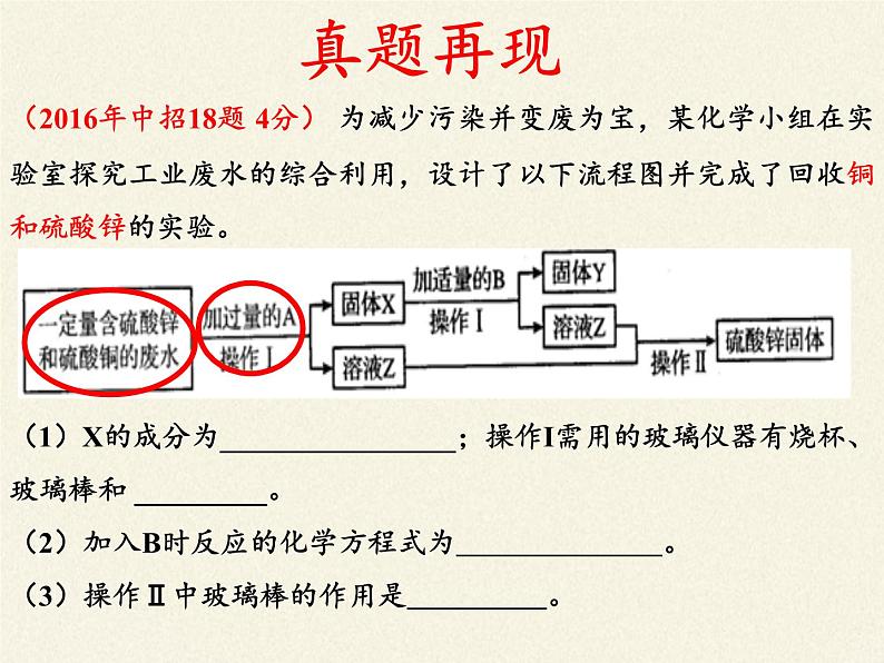 (2016年中招18题 4分)为减少污染并变废为宝,某化学小组在实验室探究工业废水的综合利用,设计了以下流程图并完成了回收铜和硫酸锌的实验。(1)X的成分为________________;操作I需用的玻璃仪器有烧杯、玻璃棒和 _________。(2)加入B时反应的化学方程式为______________(3)操作Ⅱ中玻璃棒的作用是_____________
