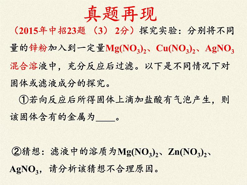 (2015年中招23题 (3) 2分)探究实验:分别将不同量的锌粉加入到一定量Mg(NO3)2、Cu(NO3)2、AgNO3混合溶液中,充分反应后过滤。以下是不同情况下对固体或滤液成分的探究。 ①若向反应后所得固体上滴加盐酸有气泡产生,则该固体含有的金属为 。 ②猜想:滤液中的溶质为Mg(NO3)2、Zn(NO3)2、AgNO3,请分析该猜想不合理原因。