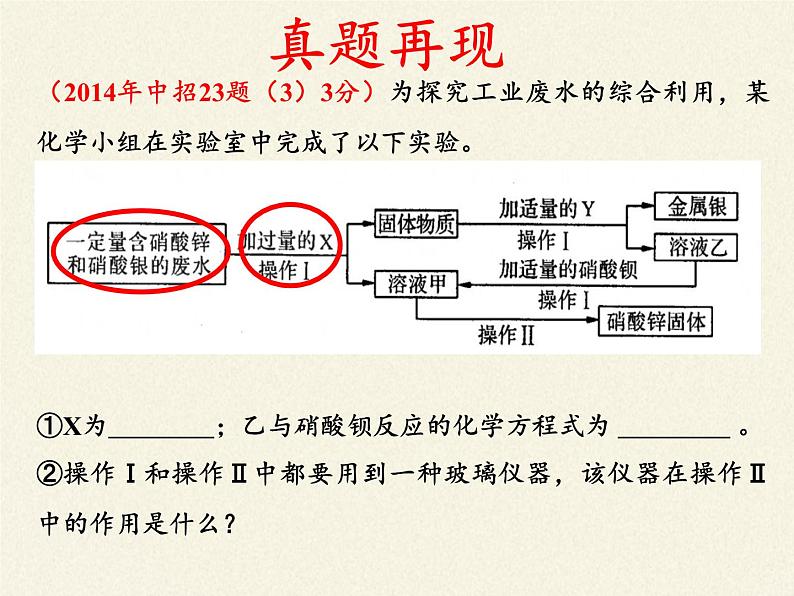 (2014年中招23题(3)3分)为探究工业废水的综合利用,某化学小组在实验室中完成了以下实验。①X为 ;乙与硝酸钡反应的化学方程式为 。②操作Ⅰ和操作Ⅱ中都要用到一种玻璃仪器,该仪器在操作Ⅱ中的作用是什么?