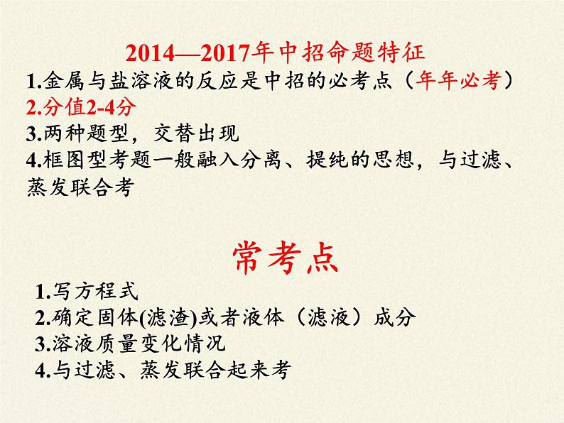 2014—2017年中招命题特征1.金属与盐溶液的反应是中招的必考点(年年必考)2.分值2-4分3.两种题型,交替出现4.框图型考题一般融入分离、提纯的思想,与过滤、蒸发联合考