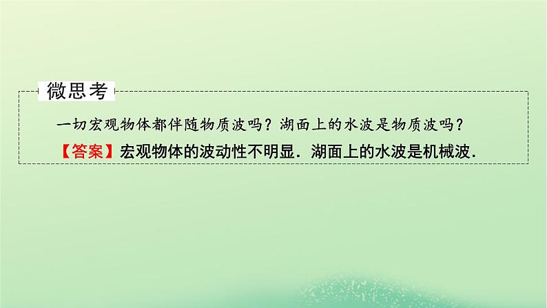宏观物体波动性的三点提醒1.一切运动着的物体都具有波动性,宏观物体观察不到其波动性,但并不能否定其波动性.2.要注意大量光子、个别光子、宏观物体、微观粒子等相关概念的区别.3.在宏观世界中,波与粒子是对立的概念;在微观世界中,波动性与粒子性可以共存.