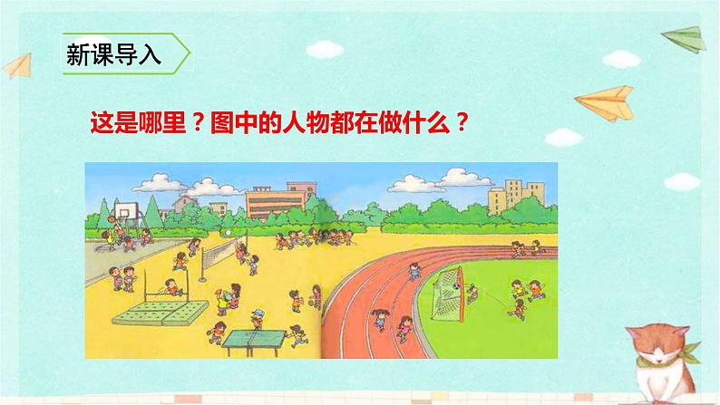 本文以体育活动为主题,由一幅图、六个词语和一首儿歌组成。词语都是体育活动的名称,儿歌描绘了下课后同学们在操场上活动的情景,告诉我们参加体育活动可以使我们的身体更健壮。