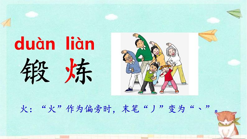 líng shēng xiǎng xià kè le铃 声 响,下 课 了。cā chǎng shàng zhēn rè na操 场 上,真 热 闹。tià shéng tī jiàn diū shā bā跳 绳 踢 毽 丢 沙 包,tiān tiān duàn liàn shēn tǐ hǎ天 天 锻 炼 身 体 好。
