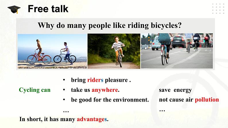 New wrds and phrases: passenger, crazy, anywhere, pllutin, rider Useful expressins: If peple bey the traffic rules, there will be fewer accidents. Cycling can help us save energy and it desn’t cause air pllutin. Talk abut the advantages and disadvantages f riding bicycles.