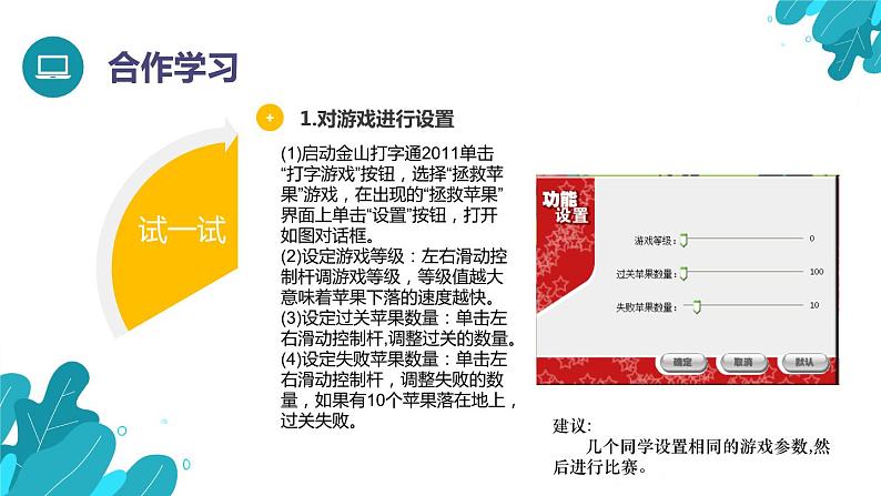 (1)启动金山打字通2011单击“打字游戏”按钮,选择“拯救苹果”游戏,在出现的“拯救苹果”界面上单击“设置”按钮,打开如图对话框。(2)设定游戏等级:左右滑动控制杆调游戏等级,等级值越大意味着苹果下落的速度越快。(3)设定过关苹果数量:单击左右滑动控制杆,调整过关的数量。(4)设定失败苹果数量:单击左右滑动控制杆,调整失败的数量,如果有10个苹果落在地上,过关失败。