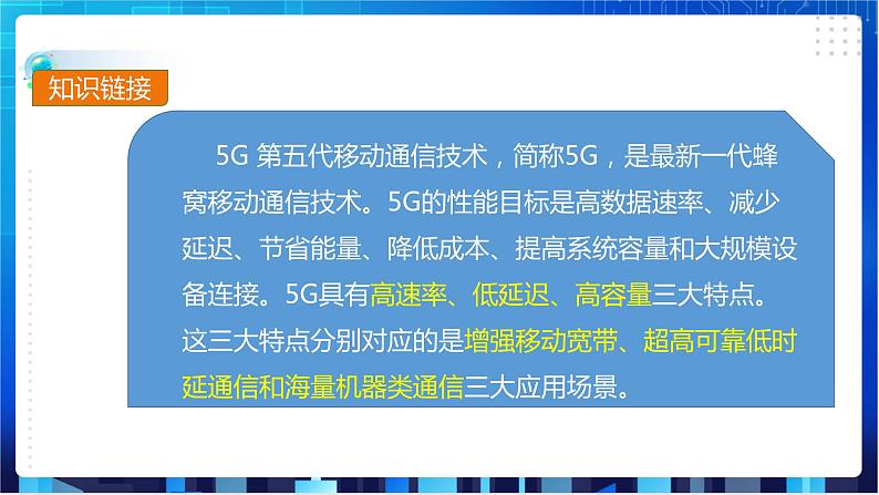5G 第五代移动通信技术,简称5G,是最新一代蜂窝移动通信技术。5G的性能目标是高数据速率、减少延迟、节省能量、降低成本、提高系统容量和大规模设备连接。5G具有高速率、低延迟、高容量三大特点。这三大特点分别对应的是增强移动宽带、超高可靠低时延通信和海量机器类通信三大应用场景。