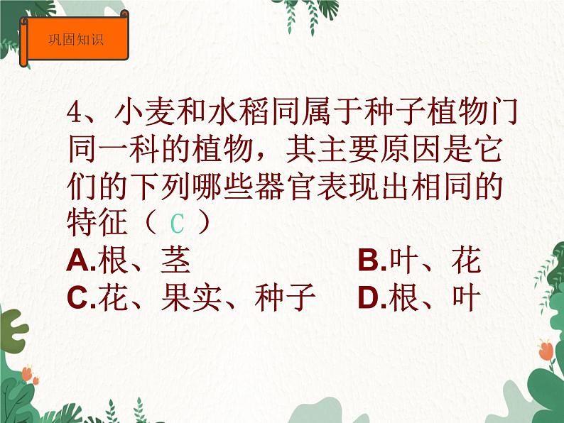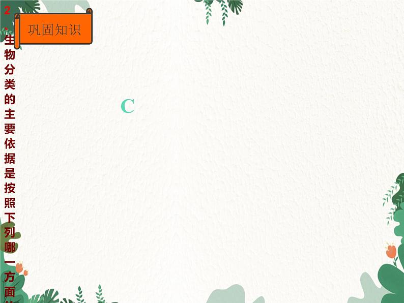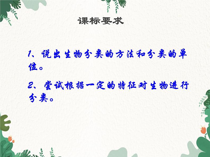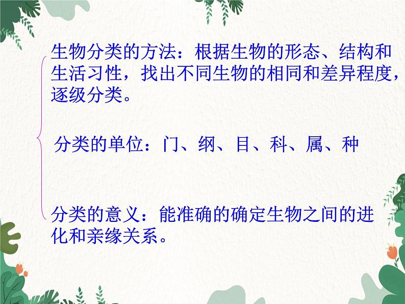 第二单元第四章 生物的分类 复习课件课标要求1、说出生物分类的方法和分类的单位。2、尝试根据一定的特征对生物进行分类。本章考点考查生物的分类依据、分类的单位。 以图解的形式根据生物的特征对生物进行分类。分类的单位:门、纲、目、科、属、种生物分类的方法:根据生物的形态、结构和生活习性,找出不同生物的相同和差异程度,逐级分类。分类的意义:能准确的确定生物之间的进化和亲缘关系。选择题:1、生物分类单位中,最大和最小的单位分别是( )A.界、纲 B.门、科 C.界、种 D.门、种C巩固知识2、生物分类的主要依据是按照下列哪一方面的特征?( )A数量 B等级 C形态结构 D大小C巩固知识3、下列动物类群①鱼类②爬行类③哺乳类④两栖类⑤鸟类中,从简单到复杂的正确排列顺序是( )A.①③②④⑤ B.①④②⑤③ C.①④③②⑤ D.④①②③⑤B巩固知识4、小麦和水稻同属于种子植物门同一科的植物,其主要原因是它们的下列哪些器官表现出相同的特征( )A.根、茎 B.叶、花 C.花、果实、种子 D.根、叶C 巩固知识5、在下列分类等级中,生物具有的相同特征最多的是( )A.界 B.属 C.纲 D.科B巩固知识6、数千年前我国黄土高原有茂密的森林,后来却成了荒山秃岭,植被减少的原因是( )。 A.地壳运动频繁 B.北方寒流长期侵袭 C.长年干旱,赤地千里 D.过度开发破坏生态平衡D 巩固知识7、下列分类单位由小到大排列的是( )A.种、科、属、目、纲、门、界 B.种、属、目、科、纲、门、界C.种、属、科、目、纲、门、界 D.属、种、科、目、纲、门、界 C巩固知识尝试:根据它们的特征进行分类总结归纳 分类时,要仔细观察生物的形态结构和生活习性找出相同和差异程度。种所有的马都属于动物的同一物种属:马属科:马科目:奇蹄目纲:哺乳纲门:脊索动物门的脊椎动物亚门种、属、科、目、纲、门马 驴 羊 猫 鱼 蛇 龟 蛙斑马犀牛大象脊索动物门的脊椎动物亚门哺乳纲奇蹄目马科马属马种植物的分类方法种--桃属--梅属科--蔷薇科目--蔷薇目纲--双子叶植物纲门--种子植物门的被子植物亚门谢谢大家!