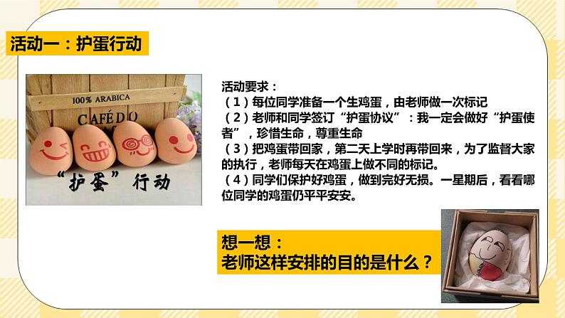活动要求:(1)每位同学准备一个生鸡蛋,由老师做一次标记(2)老师和同学签订“护蛋协议”:我一定会做好“护蛋使者”,珍惜生命,尊重生命(3)把鸡蛋带回家,第二天上学时再带回来,为了监督大家的执行,老师每天在鸡蛋上做不同的标记。(4)同学们保护好鸡蛋,做到完好无损。一星期后,看看哪位同学的鸡蛋仍平平安安。