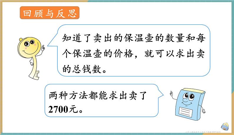 4.4 用连乘的方法解决问题列式计算。 小明每天喝 3 次水,每次喝 2 杯,他一天喝几杯水?5天喝几杯水?3×2=6(杯)5×6=30(杯)答:他一天喝 6 杯水,5 天喝 30 杯水。小学人教版数学三年级下册教学PPT课件知识点用连乘解决问题某超市一个月卖出 5 箱保温壶,每箱12个。每个保温壶售价45元,一共卖了多少钱?怎样列式?小学人教版数学三年级下册教学PPT课件知道了每箱有12个,还知道卖出5箱,每个45元。问题是“一共卖了多少钱”。阅读与理解知道数量和单价,求总价: 总价=数量×单价。小学人教版数学三年级下册教学PPT课件分析与解答小学人教版数学三年级下册教学PPT课件方法一:可以先求一箱卖了多少钱,再求一共卖了多少钱。(1)每箱卖了多少钱? 45×12=540(元)(2)一共卖了多少钱? 540×5=2700(元)45×12×5=2700(元)小学人教版数学三年级下册教学PPT课件方法二:先求出5箱共有多少个,再求一共卖了多少钱。(1)5箱共有多少个保温壶? 12×5=60(个)(2)一共卖了多少钱? 45×60=2700(元) 12×5×45=2700(元)小学人教版数学三年级下册教学PPT课件回顾与反思知道了卖出的保温壶的数量和每个保温壶的价格,就可以求出卖的总钱数。两种方法都能求出卖了2700元。小学人教版数学三年级下册教学PPT课件解决两步计算的连乘应用题,要根据已知条件找间接量,确定好先算什么,再算什么。当连乘应用题求的是总数时,可以先求出每份的数量,再乘总份数;也可以先求出总份数,再乘每份的数量。小学人教版数学三年级下册教学PPT课件小试牛刀 三(1)班4个小组的同学去摘苹果,每个小组8人,平均每人摘15千克。一共摘了多少千克苹果?(选自教材P47 做一做)4×8×15=480(千克)答:一共摘了480千克苹果。小学人教版数学三年级下册教学PPT课件1.三(2)班同学坐缆车,一共坐满了15辆,每辆缆车坐2人,每人12元,坐缆车一共要用多少元?2×15×12=360(元)答:坐缆车一共要用360元。小学人教版数学三年级下册教学PPT课件2.田径场的跑道长400米,小红每天跑2圈。她一个星期(7天)共跑多少米?(选自教材P49 T1)400×2×7=5600(米) 答:她一个星期(7天)跑5600米。小学人教版数学三年级下册教学PPT课件3.一个西瓜大棚有8垄,每垄种35棵西瓜秧。如果每棵西瓜秧结2个西瓜,一共结多少个西瓜? (选自教材P49 T2)8×35×2=560(个) 答:一共结560个西瓜。小学人教版数学三年级下册教学PPT课件4.(选自教材P49 T4)12×3×24=864(瓶) 答:一共有864瓶矿泉水。3次正好运完这些矿泉水。一共有多少瓶矿泉水?每箱24瓶小学人教版数学三年级下册教学PPT课件这节课你们都学会了哪些知识? 解决两步计算的连乘应用题,要根据已知条件找间接量,确定好先算什么,再算什么。当连乘应用题求的是总数时,可以先求出每份的数量,再乘总份数;也可以先求出总份数,再乘每份的数量。小学人教版数学三年级下册教学PPT课件作业1:完成教材相关练习题。作业2:完成练习题。小学人教版数学三年级下册教学PPT课件