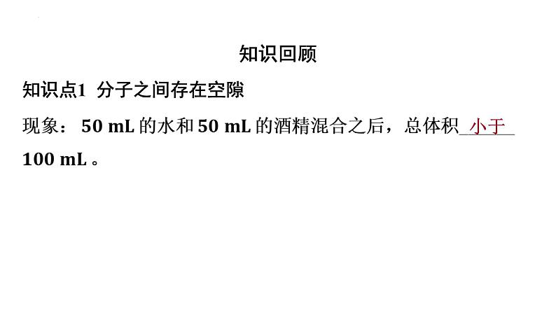 (1)扩散现象:不同的物质在互相接触时,彼此进入对方的现象。例如:红墨水在清水中扩散。注意:①扩散是物质自发进行的;②扩散是宏观现象。(2)扩散现象表明:一切物质的分子都在永不停息地做无规则运动,且温度越高,分子热运动越______。