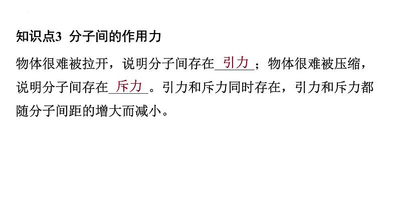 物体很难被拉开,说明分子间存在______;物体很难被压缩,说明分子间存在______。引力和斥力同时存在,引力和斥力都随分子间距的增大而减小。
