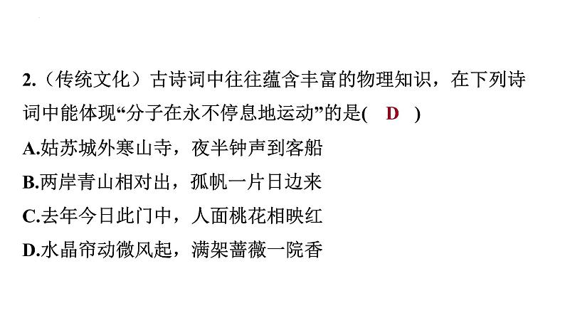 2.(传统文化)古诗词中往往蕴含丰富的物理知识,在下列诗词中能体现“分子在永不停息地运动”的是( )