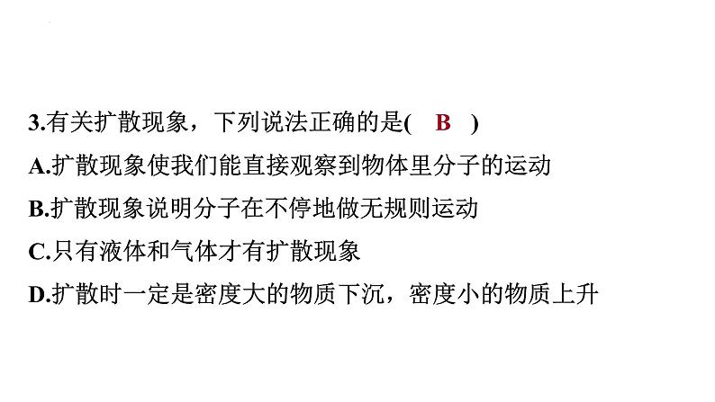 A.扩散现象使我们能直接观察到物体里分子的运动B.扩散现象说明分子在不停地做无规则运动C.只有液体和气体才有扩散现象D.扩散时一定是密度大的物质下沉,密度小的物质上升