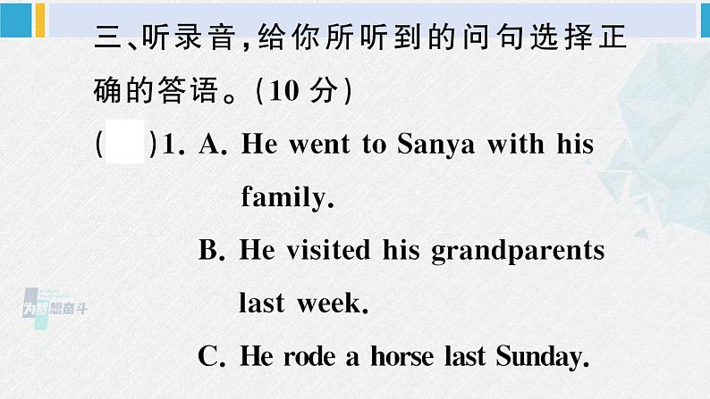 这是一份人教版六年级英语下册 Unit 4 综合训练(原卷版+答案+听力+听力材料+讲解课件),文件包含人教版六年级英语下册Unit4综合训练课件pptx、人教版六年级英语下册Unit4综合训练doc、人教版六年级英语下册Unit4综合训练听力材料doc、人教版六年级英语下册Unit4综合训练听力mp3等4份课件配套教学资源,其中PPT共36页, 欢迎下载使用。