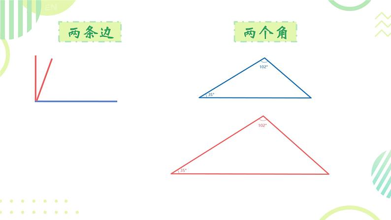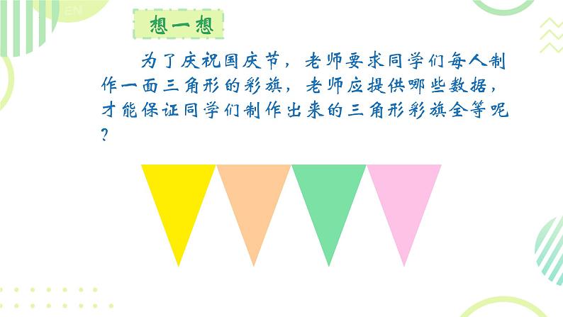 为了庆祝国庆节,老师要求同学们每人制作一面三角形的彩旗,老师应提供哪些数据,才能保证同学们制作出来的三角形彩旗全等呢?