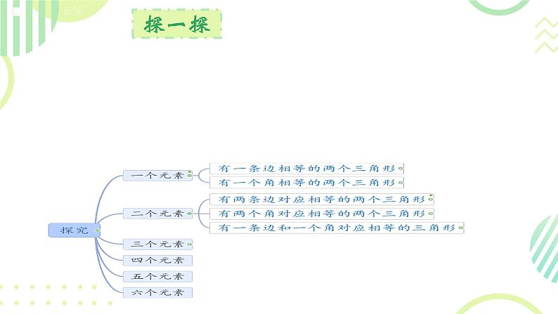 这是一份初中数学3 探索三角形全等的条件教学演示课件ppt,共18页。PPT课件主要包含了想一想,探一探,一条边,一个角,两条边,两个角,一条边和一个角,三个角,动手操作,三条边等内容,欢迎下载使用。