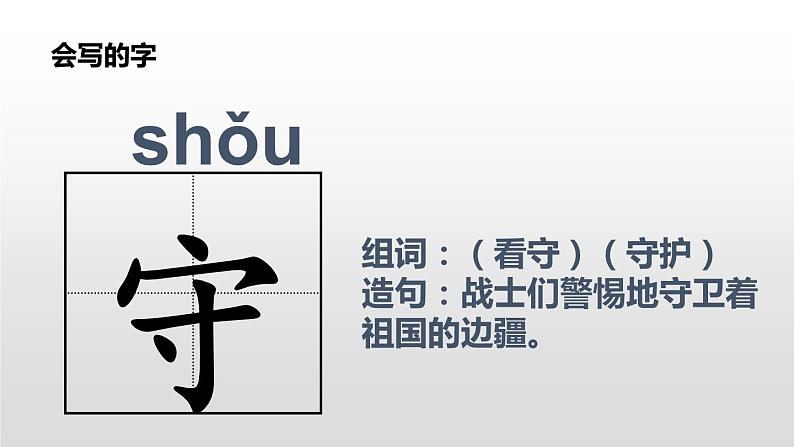 组词:(看守)(守护)造句:战士们警惕地守卫着祖国的边疆。