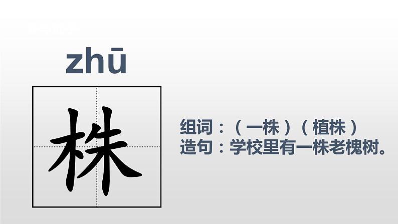 组词:(一株)(植株)造句:学校里有一株老槐树。