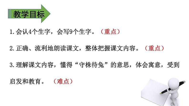 1.会认4个生字,会写9个生字。(重点)2.正确、流利地朗读课文,整体把握课文内容。(重点)3.理解课文内容,懂得“守株待兔”的意思,体会寓意,受到启发和教育。 (难点)