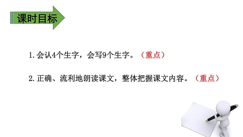 1.会认4个生字,会写9个生字。(重点)2.正确、流利地朗读课文,整体把握课文内容。(重点)