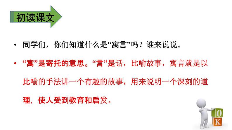 同学们,你们知道什么是“寓言”吗?谁来说说。“寓”是寄托的意思。“言”是话,比喻故事,寓言就是以比喻的手法讲一个有趣的故事,用来说明一个深刻的道理,使人受到教育和启发。