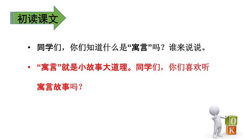 同学们,你们知道什么是“寓言”吗?谁来说说。“寓言”就是小故事大道理。同学们,你们喜欢听寓言故事吗?