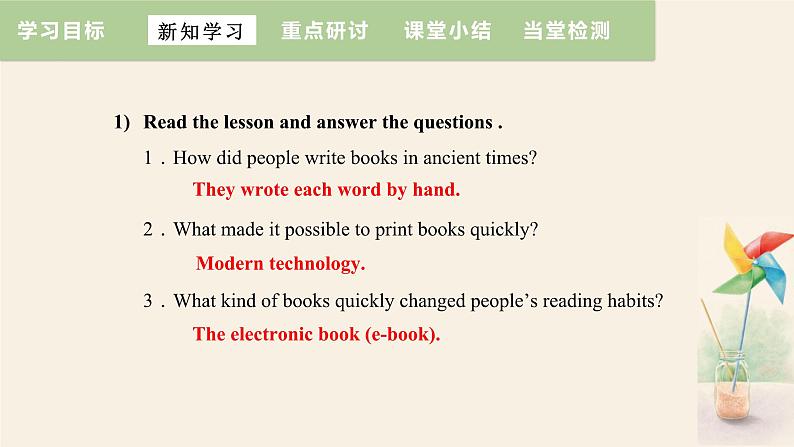 1.能熟悉并能正确运用本课时的重点单词和短语2.能够用英语简单描述书籍的发展历史和有关电 子书知识