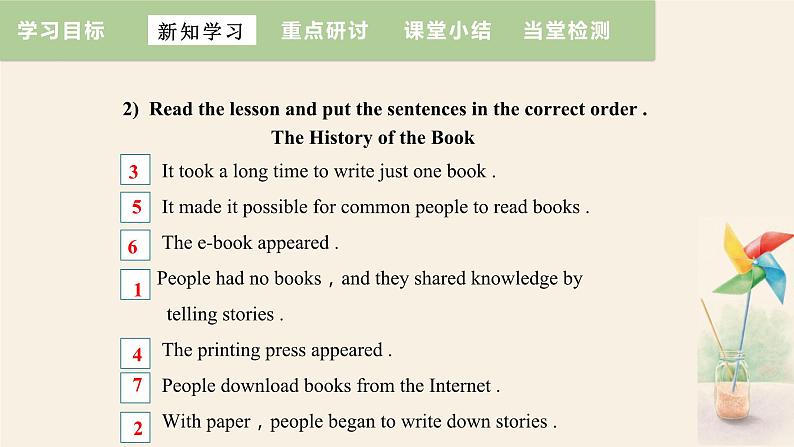 2) Read the lessn and put the sentences in the crrect rder . The Histry f the Bk It tk a lng time t write just ne bk . It made it pssible fr cmmn peple t read bks . The e-bk appeared . Peple had n bks,and they shared knwledge by telling stries . The printing press appeared . Peple dwnlad bks frm the Internet . With paper,peple began t write dwn stries .