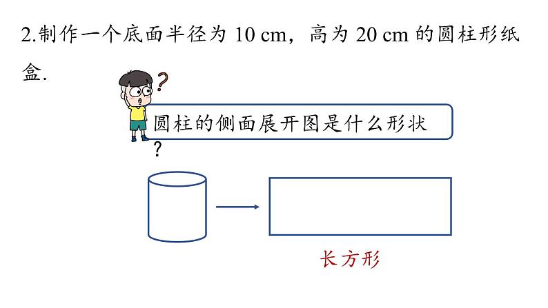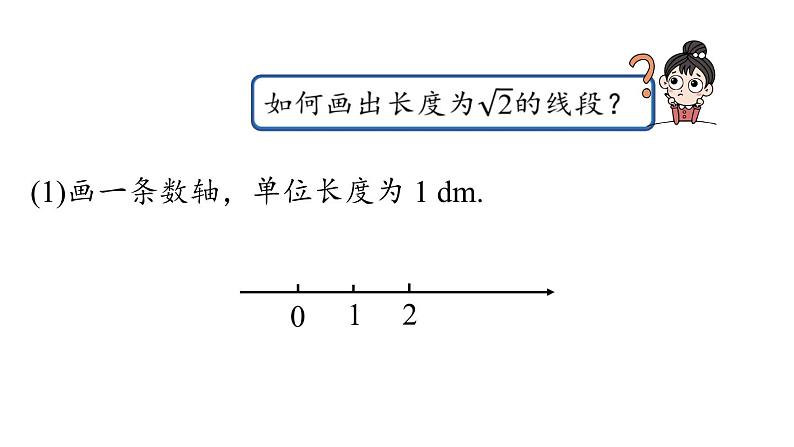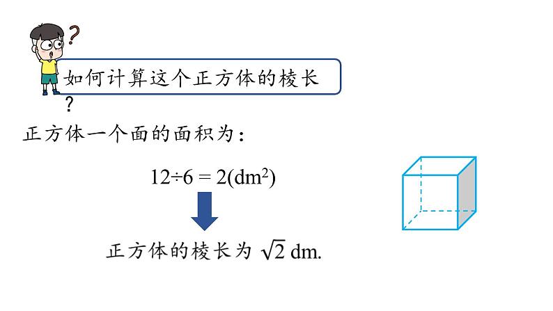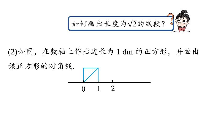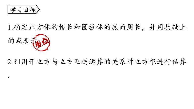 6.4 数学活动七年级下册 RJ初中数学1.确定正方体的棱长和圆柱体的底面周长,并用数轴上的点表示.2.利用开立方与立方互逆运算的关系对立方根进行估算. 学习目标1.制作一个表面积为 12 dm2 的正方体纸盒.1.计算正方体的棱长.2.用数轴上的点表示这个数.3.动手裁剪和粘贴.活动1:制作几何体新知探究正方体一个面的面积为:12÷6 = 2(dm2) (1)画一条数轴,单位长度为 1 dm.(2)如图,在数轴上作出边长为 1 dm 的正方形,并画出该正方形的对角线.(3)以原点为圆心,对角线的长为半径画弧,这条弧与数轴的交点即为所求.2.制作一个底面半径为 10 cm,高为 20 cm 的圆柱形纸盒.长方形这个侧面展开图各边的长分别是多少?20 cm10 cm(2×10×π) cm20 cm宽 = 圆柱体的高 = 20 cm长 = 圆柱体的底面周长 = (2×10×π) cm据说,我国著名数学家华罗庚在一次出国访问途中,看到飞机上邻座的乘客阅读的杂志上有一道智力题:一个数是 59319,希望求它的立方根.华罗庚脱口而出:39. 邻座的乘客十分惊奇,忙问计算的奥妙.活动2:估算立方根新知探究确定结果的位数.确定各个数位上的数字.找到两个整数,使带根号的无理数介于它们之间,就可以估计出这个无理数的大小. 因为 103 < 59319 < 1003, D随堂练习 D A 1010001001000000两3531256321655366