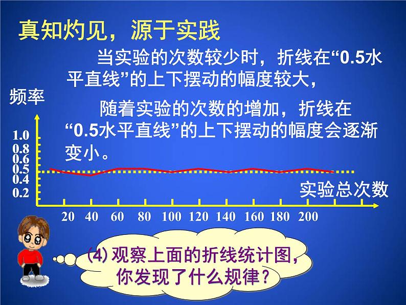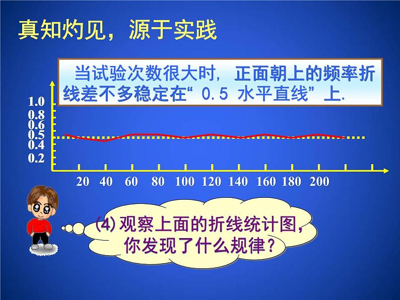 当试验次数很大时, 正面朝上的频率折线差不多稳定在“ 0.5 水平直线” 上.