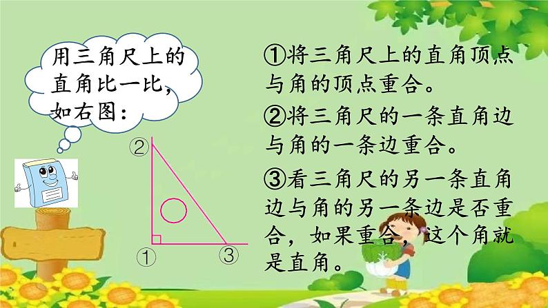 ③看三角尺的另一条直角边与角的另一条边是否重合,如果重合,这个角就是直角。