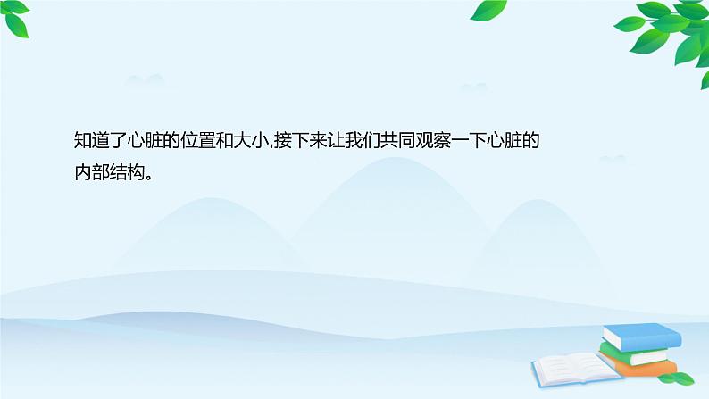 初步感知心脏的有关 结构:摸摸胸口,感受心脏的跳动和位置;看看图片,了解心脏的形状和结构,推测心脏由哪种组织组成。