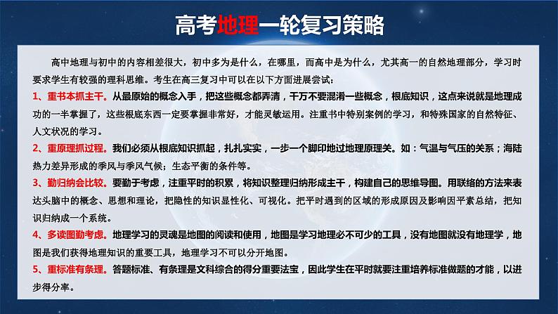 高中地理与初中的内容相差很大,初中多为是什么,在哪里,而高中是为什么,尤其高一的自然地理部分,学习时要求学生有较强的理科思维。考生在高三复习中可以在以下方面进展尝试:1、重书本抓主干。从最原始的概念入手,把这些概念都弄清,千万不要混淆一些概念,根底知识,这点来说就是地理成功的一半掌握了,这些根底东西一定要掌握非常好,才能灵敏运用。注重书中特别案例的学习,和特殊国家的自然特征、人文状况的学习。2、重原理抓过程。我们必须从根底知识抓起,扎扎实实,一步一个脚印地过地理原理关。如:气温与气压的关系;海陆热力差异形成的季风与季风气候;生态平衡的条件等。3、勤归纳会比较。要勤于考虑,注重平时的积累,将知识整理归纳形成主干,构建自己的思维导图。用联络的方法来表达头脑中的概念、思想和理论,把隐性的知识显性化、可视化。把平时遇到的区域的形成原因及影响因平素总结,把知识归纳成一个系统。4、多读图勤考虑。地理学习的灵魂是地图的阅读和使用,地图是学习地理必不可少的工具,没有地图就没有地理学,地图是我们获得地理知识的重要工具,地理学习不可以分开地图。5、重标准有条理。答题标准、有条理是文科综合的得分重要法宝,因此学生在平时就要注重培养标准做题的才能,以进步得分率。