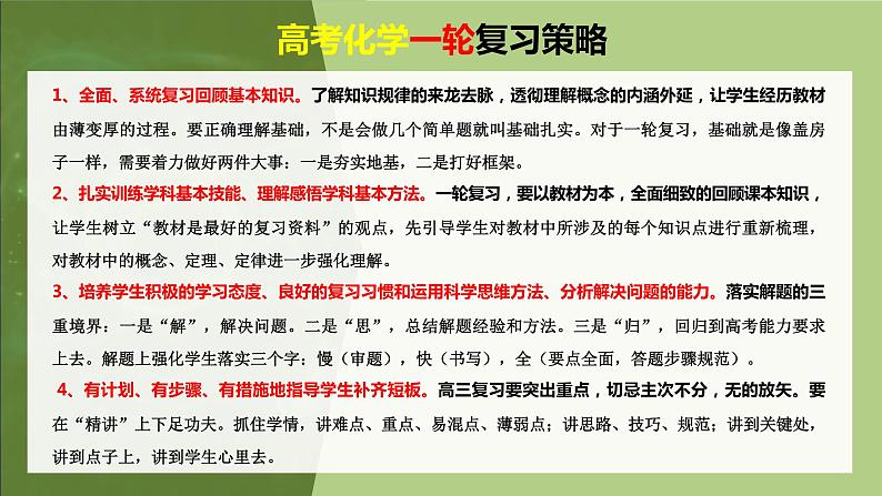 1、全面、系统复习回顾基本知识。了解知识规律的来龙去脉,透彻理解概念的内涵外延,让学生经历教材由薄变厚的过程。要正确理解基础,不是会做几个简单题就叫基础扎实。对于一轮复习,基础就是像盖房子一样,需要着力做好两件大事:一是夯实地基,二是打好框架。2、扎实训练学科基本技能、理解感悟学科基本方法。一轮复习,要以教材为本,全面细致的回顾课本知识,让学生树立“教材是最好的复习资料”的观点,先引导学生对教材中所涉及的每个知识点进行重新梳理,对教材中的概念、定理、定律进一步强化理解。3、培养学生积极的学习态度、良好的复习习惯和运用科学思维方法、分析解决问题的能力。落实解题的三重境界:一是“解”,解决问题。二是“思”,总结解题经验和方法。三是“归”,回归到高考能力要求上去。解题上强化学生落实三个字:慢(审题),快(书写),全(要点全面,答题步骤规范)。 4、有计划、有步骤、有措施地指导学生补齐短板。高三复习要突出重点,切忌主次不分,无的放矢。要在“精讲”上下足功夫。抓住学情,讲难点、重点、易混点、薄弱点;讲思路、技巧、规范;讲到关键处,讲到点子上,讲到学生心里去。