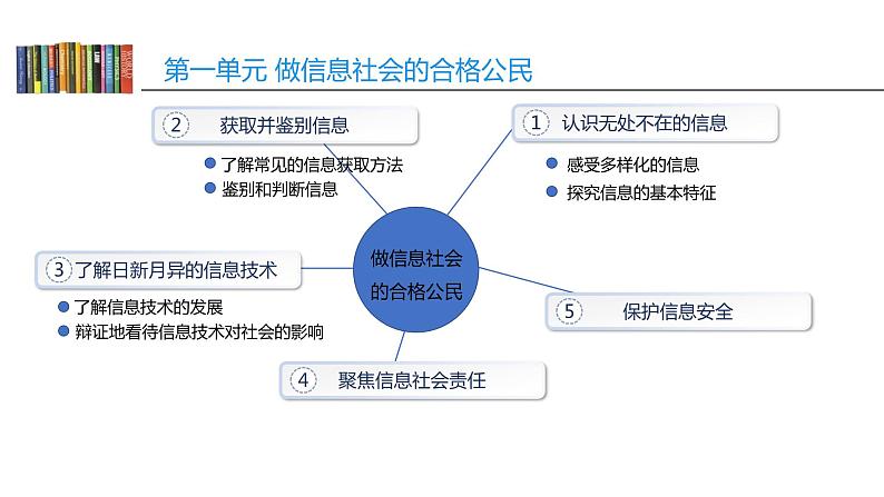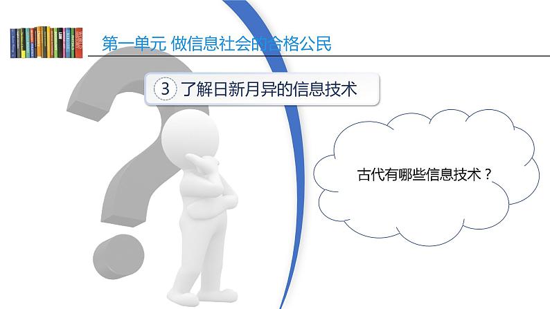 第一单元 做信息社会的合格公民第一单元 做信息社会的合格公民第一单元 做信息社会的合格公民第一单元 做信息社会的合格公民资料:2002年10月6日,一艘载有128名中国游客的越南籍游船偏离航道触礁。游船随时可能沉没,船上既没有救生措施,也无法与外界联系。就在这一紧急关头,一名乘客发现自己的手机有微弱的信号,他立刻通过手机向外界发送呼救信息,与有关部门取得了联系。经多方救助,128名乘客终于获救。在整个救援过程中,这部手机成了游船与外界联系的唯一工具。在游客生命处于危机的时刻,他们利用什么工具通过什么样的方式得到救助?第一单元 做信息社会的合格公民说一说你眼中的信息技术?第一单元 做信息社会的合格公民信息技术是指利用计算机和现代通讯手段获取、传递、存储、处理、显示信息和分配信息的技术。信息技术是指研究信息如何产生、获取、传输、变换、识别和应用的科学技术。信息技术的概念:信息技术是指有关信息的采集、储存、传递、处理和利用等的技术和方法。第一单元 做信息社会的合格公民古代有哪些信息技术?第一单元 做信息社会的合格公民马匹驿站飞鸽传书烽火狼烟AB观看《信息技术发展历程》微视频,同学们以小组为单位从两个方面总结归纳视频中的内容:(1)信息技术从古到今经历了那几个发展阶(2)每个发展阶段的历史意义是什么?第一单元 做信息社会的合格公民第一单元 做信息社会的合格公民信息技术的发展历程:语言的使用文字的出现印刷技术的发明电话、电视、广播的发明普及电子计算机的普及第一单元 做信息社会的合格公民信息技术的发展历程:语言的使用在从猿到人的转变过程中,随着原始进化人的协同劳动、想法交流逐渐增多,利用简单的肢体语言不能够表示其所表达的意义时,便促进了语言的产生。第一单元 做信息社会的合格公民文字的出现信息技术的发展历程: 语言是不能随着时空保存下来的。人们为了记录发生过的事情,发明了结绳记事法,使得信息得以长期保存。但是,当结绳过多时,自己也想不起来发生了什么事情。于是人们开始进一步改进记录信息的方法,发明了文字,最早是象形文字。印刷技术的发明信息技术的发展历程:甲骨文和竹简都过于笨重,不便携带,因此不利于信息传播和推广。多方面的因素最终导致人们在发明了闻名世界的造纸术(东汉蔡伦)、印刷术(宋毕昇)。这进一步推动了信息技术的进一步革新。第一单元 做信息社会的合格公民电话、电视、广播的发明普及信息技术的发展历程:1844年莫尔斯发明电报1876年贝尔发明电话第一单元 做信息社会的合格公民电子计算机的普及信息技术的发展历程:1946年第一台电子计算机问世手机、电脑、平板第一单元 做信息社会的合格公民未来的信息技术是怎样的?第一单元 做信息社会的合格公民第一单元 做信息社会的合格公民AB以小组为单位从积极影响和消极影响两反面讨论“信息技术对社会的影响”并举证,看谁举例多,考虑周详。第一单元 做信息社会的合格公民第一单元 做信息社会的合格公民技术是一把双刃剑,在人类获得利益的同时,也带来了各种各样的问题。基于信息技术的两面性,我们在运用信息技术的同时要更加严格地督促自己,是信息技术的运用更加合理化,让信息技术更好地造福人类。第一单元 做信息社会的合格公民第一次语言的使用第二次文字的创造第三次印刷术的发明第四次电报、电话、广播从猿到人的重要标志有利于信息的储存和传递为信息的积累和传播提供保证使信息交流突破了时间和空间的限制第五次电子计算机使人类慢慢迈入数字化时代教师: XXX下节课见!!!电话:XXXXXXX