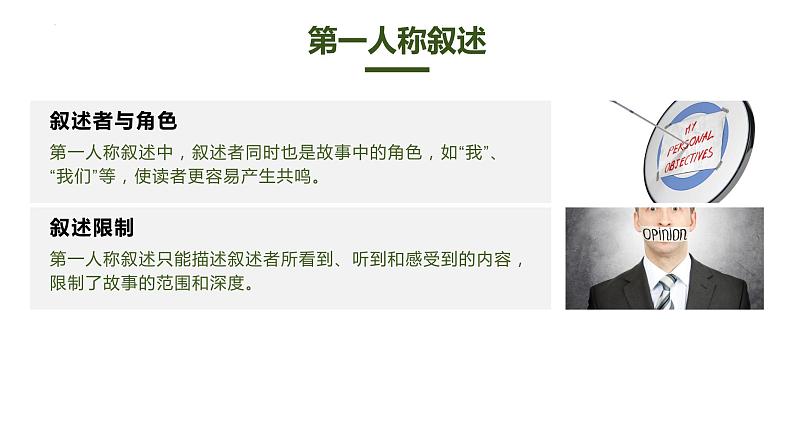 这是一份2024届高考语文复习:小说叙述视角及其作用 课件,共23页。PPT课件主要包含了叙述人称种类,第一人称叙述,第二人称叙述,全知叙述,有限叙述,客观叙述,第三人称叙述,第一人称叙述的作用,第二人称叙述的作用,拉近读者距离等内容,欢迎下载使用。