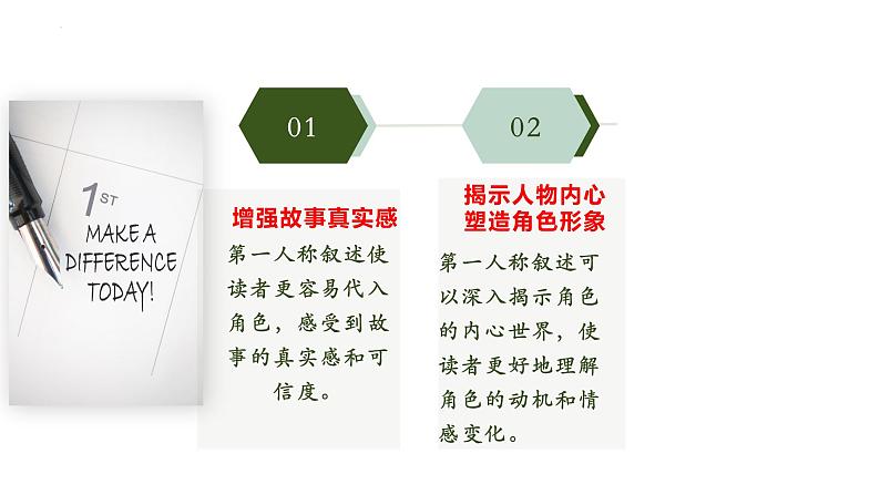 第一人称叙述中,叙述者同时也是故事中的角色,如“我”、“我们”等,使读者更容易产生共鸣。