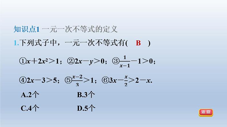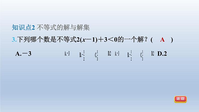 知识点2 不等式的解与解集3.下列哪个数是不等式2(x-1)+3<0的一个解?( A )